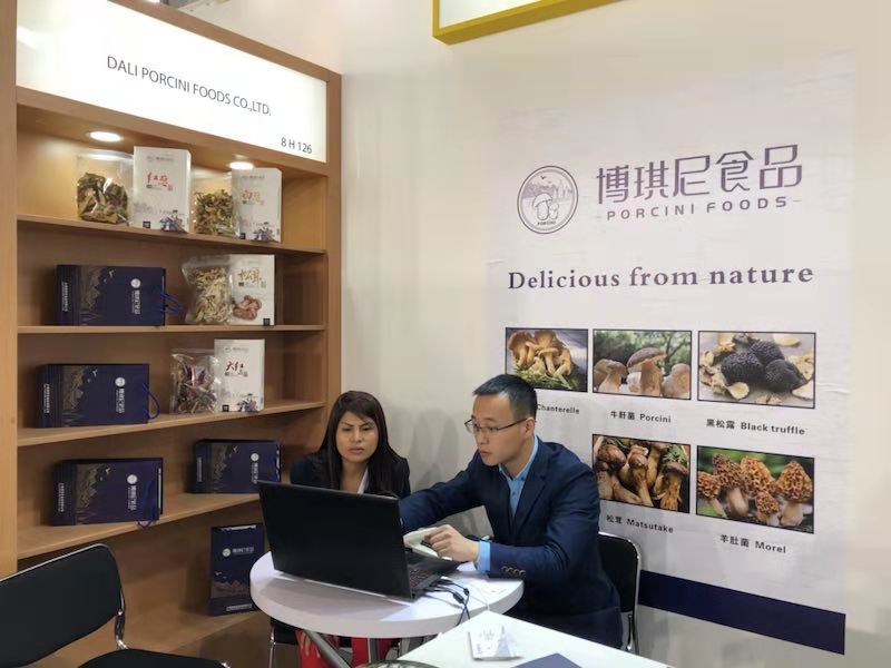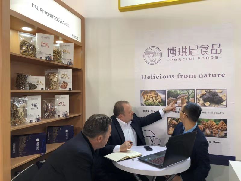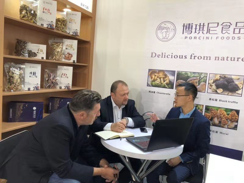 展會第一天,外國客商在博琪尼食品有限公司展位前紛紛駐足,詢問產品相關信息,了解產品質量、規格等,客商們對博琪尼食品公司優質的產品質量及豐富的出口經驗給予充分肯定。其中,來自波蘭的客商Stanistaw Tomkowiak及其合伙人與博琪尼總經理龔瑞波進行洽談之后,就公司主營產品速凍牛肝菌達成合作意向,初步訂購數量為兩個柜,并有意簽署長期合作合同。法國客商April對博琪尼出口產品速凍松茸頗為感興趣,表示在法國越來越多的餐廳選擇用優質松茸及牛肝菌作為輔材加入到菜品當中,并受到食客的喜愛,法國對菌類的需求有增無減,希望與博琪尼達成合作,將中國的優質菌類帶給法國人民。